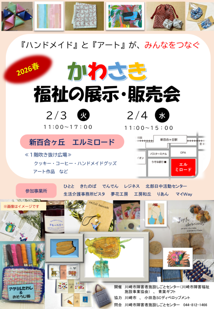 3回目となります「かわさき福祉の展示・販売会」を、小田急SCディベロップメントさんのご協力を得て、川崎市さん、川崎市障害福祉施設事業協会さんと協働で開催することとなりました。お菓子やアクセサリー、コーヒ-など多数の商品を準備しておりますので、是非、ご来店ください。